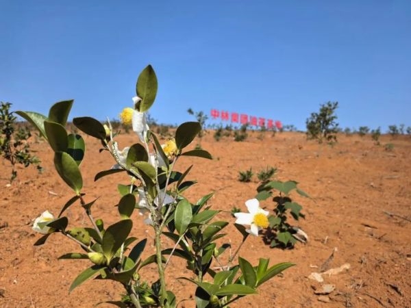 你看,黃土與藍天相襯出無需濾鏡的艷麗景色,這幅大畫卷下,綠油油的油茶樹正汲取著陽光努力生長。細看它花與果同期,遠看這樹與景相依,生機活力與盎然色彩占滿眼簾,怎能不叫人沉醉?