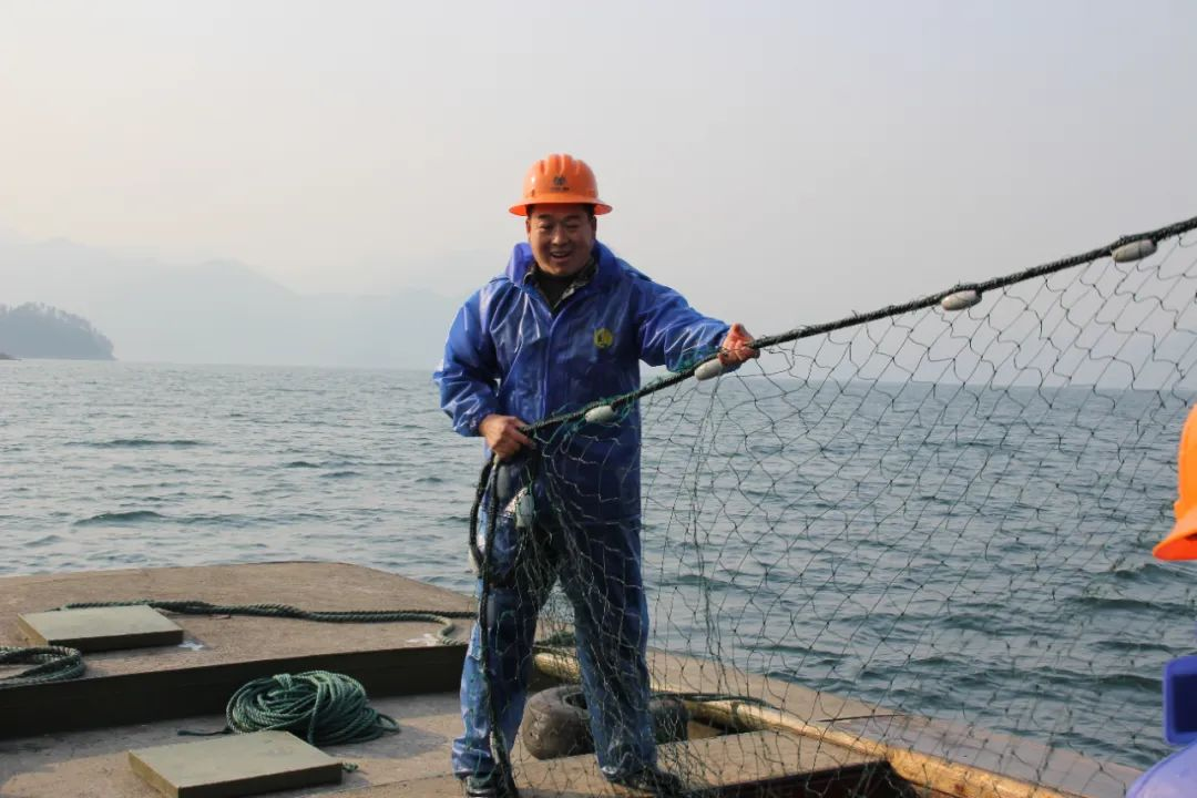 作為土生土長的淳安人,葉志清從小喜歡捕魚。1986年參加工作來到千發公司捕撈隊后,憑借肯學愛鉆的勁頭,很快熟練掌握了“攔、趕、刺、張”聯合漁具漁法的運用,成為了捕撈隊的骨干。“之前我們都是憑借自己的經驗來尋找魚群的。夜晚通過魚群起跳的水花聲判斷魚群的種類,天亮后就觀察水花的形狀、細聞魚腥味來判斷魚群的位置......”葉志清的這手“聽魚”絕活,是他硬磨出來的功夫。在他的帶領下,捕撈隊曾創下一網捕獲41萬公斤的最高紀錄,如今,捕魚是千島湖有機魚全產業鏈中重要的一環,生產環節也開發成“中華一絕——巨網捕魚”旅游項目,成為千島湖生態旅游的一張金名片。