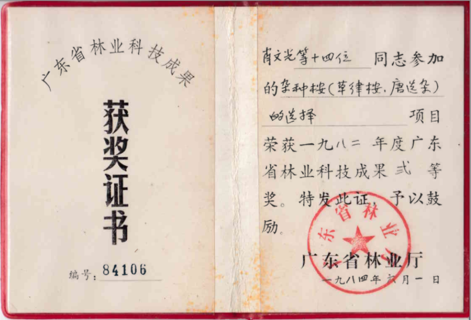 廣東省林業廳授予肖文光等人科技成果二等獎(1982年度)