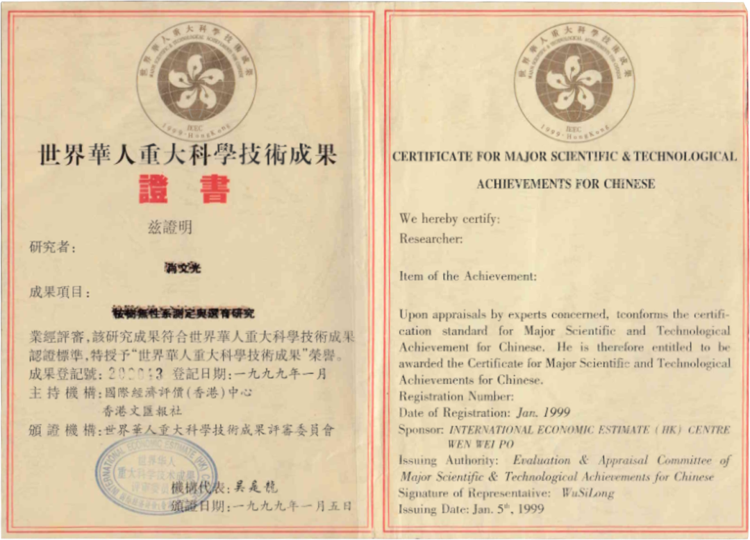 肖文光獲“世界華人重大科學技術成果“榮譽(1999年度)