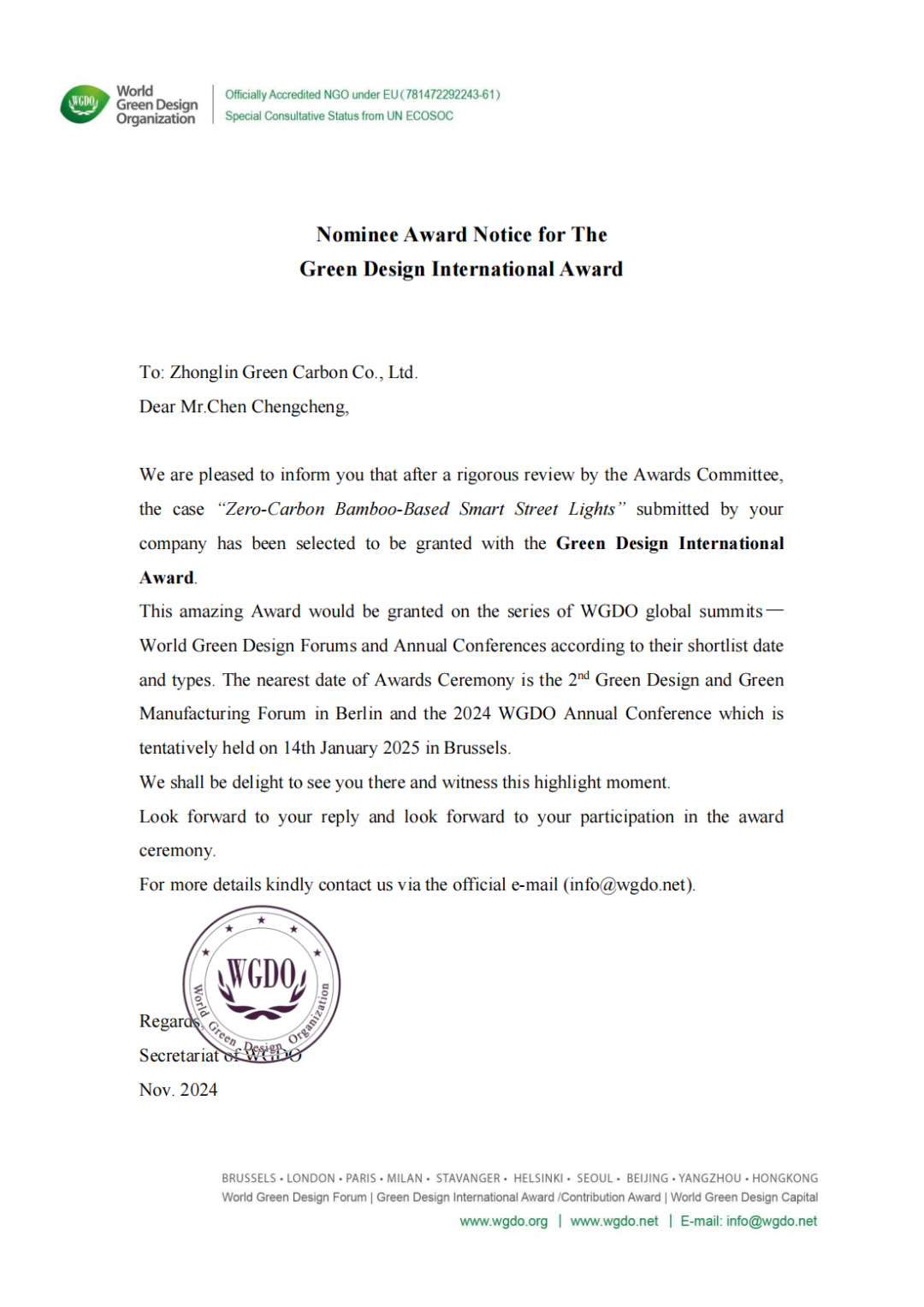 近日,世界綠色設計組織(World Green Design Organization,簡稱 WGDO)在全球范圍內(nèi)征集綠色設計案例,中林綠碳竹基智慧燈桿項目經(jīng)過評獎委員會的嚴格審查,已被授予綠色設計國際大獎 (Green Design International Award) ,將于WGDO全球峰會系列活動世界綠色設計論壇上正式頒發(fā)。