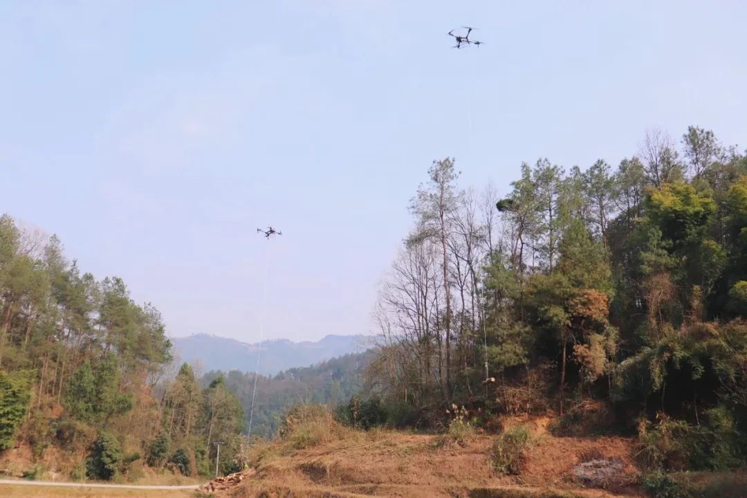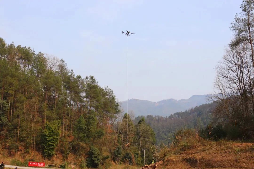 伴隨著一陣雄渾的轟鳴聲,兩架多旋翼無人機猶如矯健的雄鷹迅速升空,它們各自攜帶著粗壯的繩索,在操控者的精準操作下,敏捷地穿梭于山巒之間,快速定位到一處松材線蟲病疫木堆放點。地面人員迅速將松木捆綁并掛上掛鉤,無人機隨即穩穩地拉起一百多斤重的疫木,向著目的地飛去。僅僅三分鐘,從吊裝、轉運到卸載,整個過程一氣呵成,高效至極。