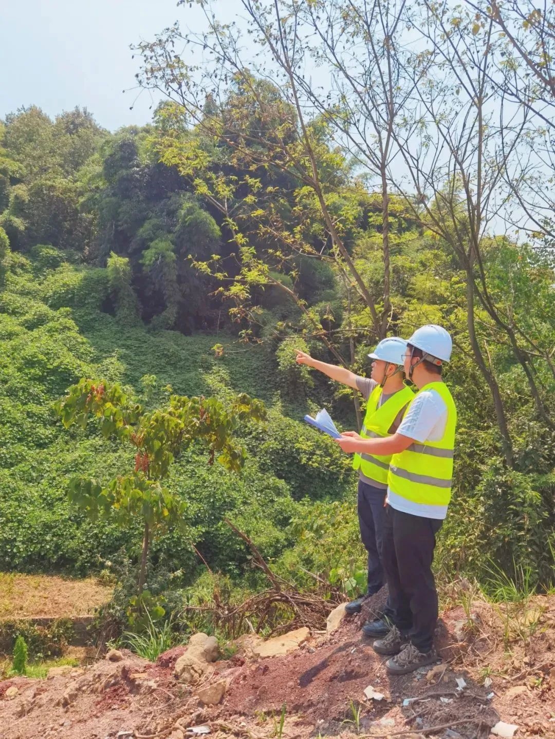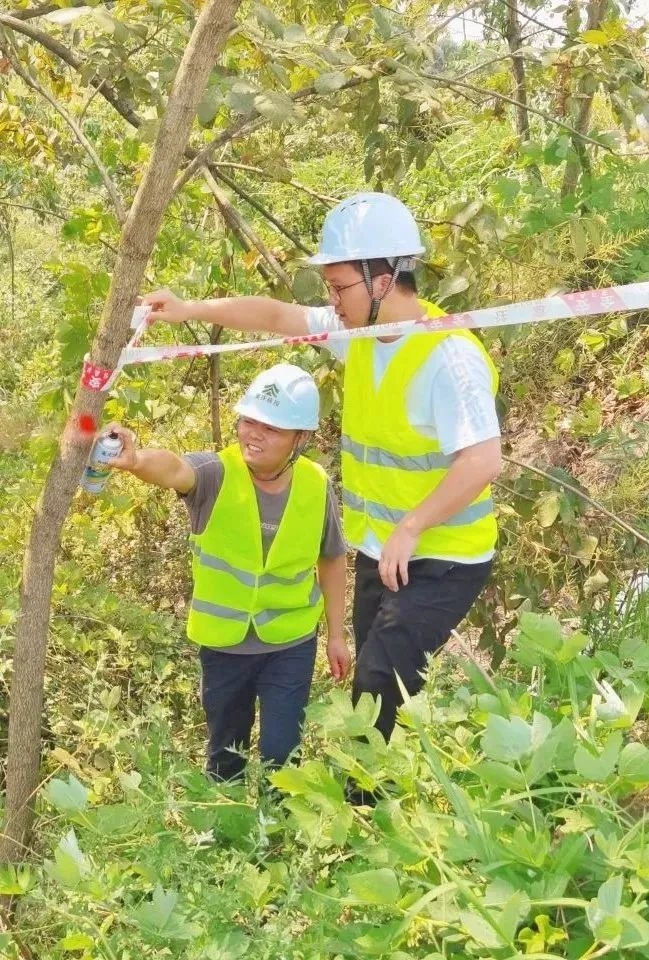 淬火鑄鐵軍,青山證丹心。那段時間銅梁區(qū)連續(xù)高溫預(yù)警,項(xiàng)目部青年突擊隊(duì)成員鄒峰嵐和吳雪民作為黨員,沖鋒在前,持續(xù)在“炙烤模式”中澆筑綠色屏障——他們充分利用施工空窗期,為防火隔離帶中的珍貴闊葉樹系上“生態(tài)身份證”,在蒸騰熱浪中為每寸山林鐫刻守護(hù)坐標(biāo)。